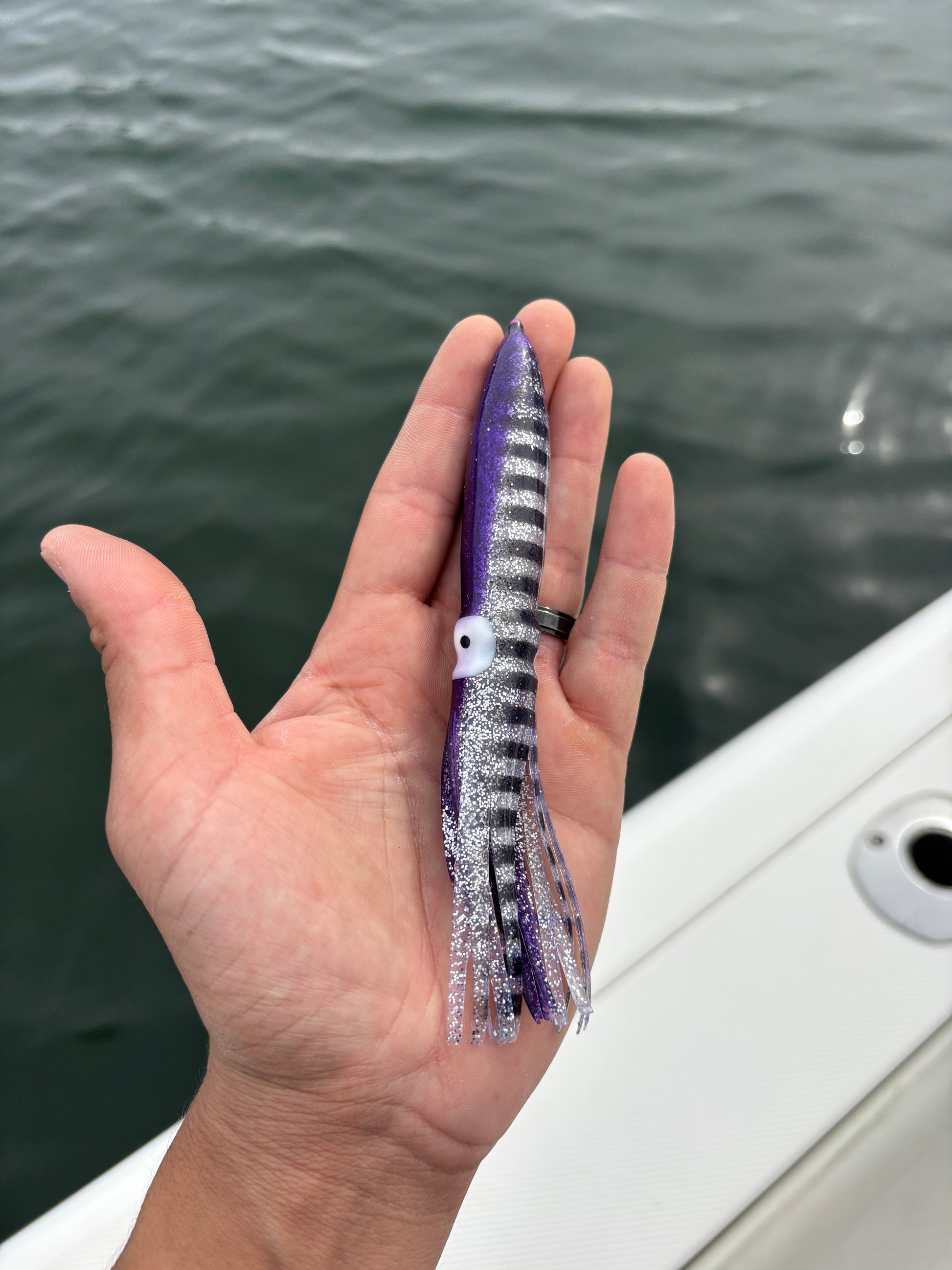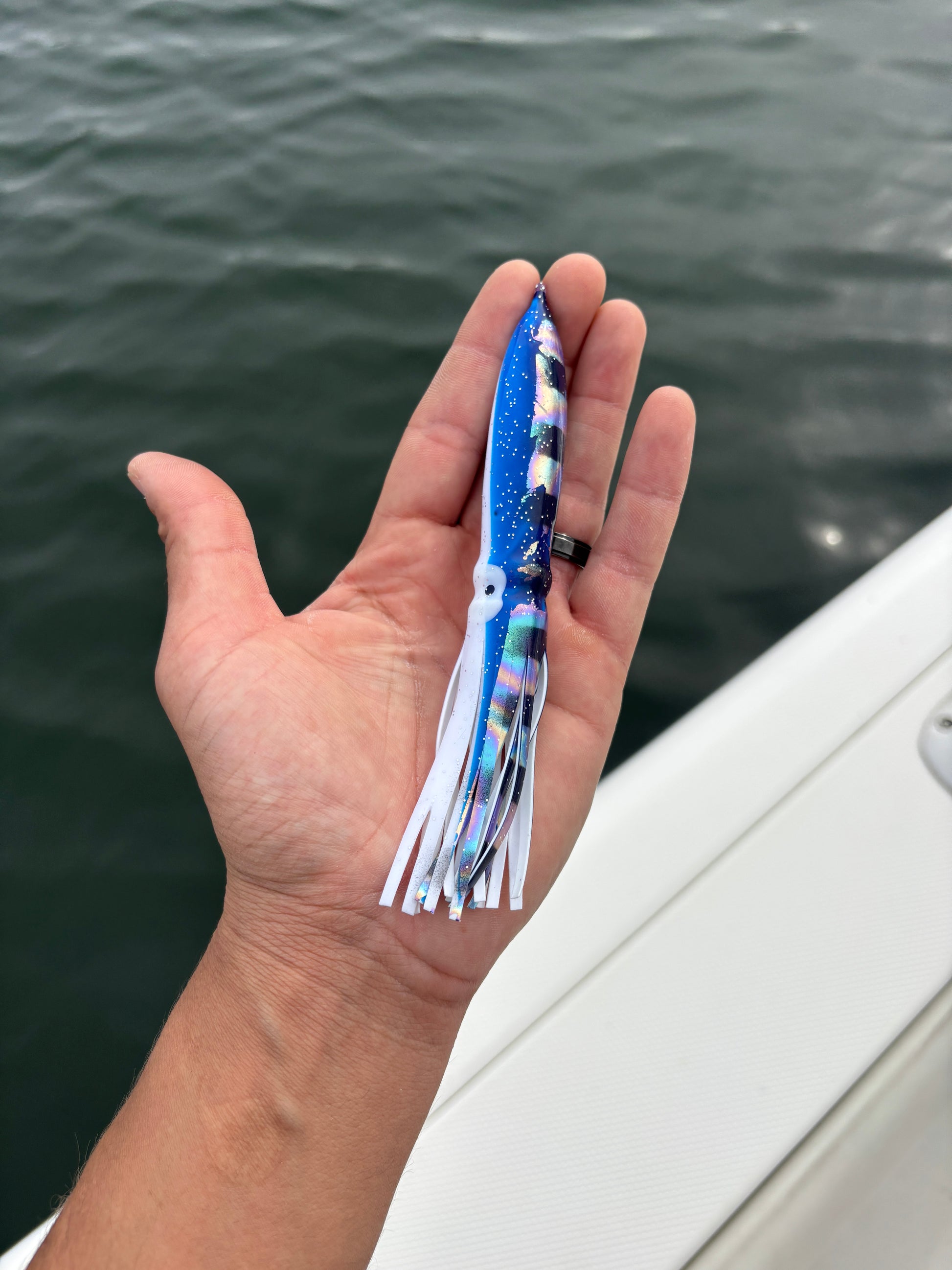 The Cali Chain is a daisy chain style troller rigged up with three of my custom birds, three 9” squid, and one 14” stinger squid. The chains are rigged with 300# mono and 9/0 Mustad hook. The birds creat a ton of splash and commotion up on the surface which brings the tuna in to check things out and get bit!